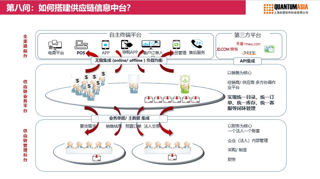 最核心的,最關鍵的,要能夠實現統一的訂單管理和庫存管理。訂單管理的閉環和庫存管理的閉環,要在供應鏈信息中臺中體現。如果在這個基礎之上,還能實現統一的商品目錄、統一的客服等等其他的統一管理更好。