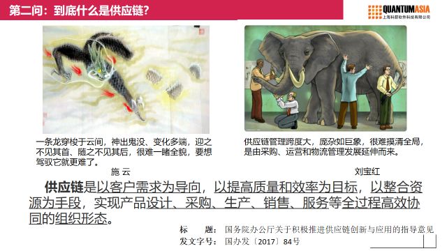 2017年,國務院辦公廳關于供應鏈創新的公文,給供應鏈下了一個定義:供應鏈是以客戶需求為導向,以提高質量和效率為目標,以整合資源為手段,實現產品設計、采購、生產、銷售、服務等全過程高效協同的組織形態。這個定義闡明了供應鏈的導向、目標、手段及本質,一經發布,就受到業界廣泛的認可。