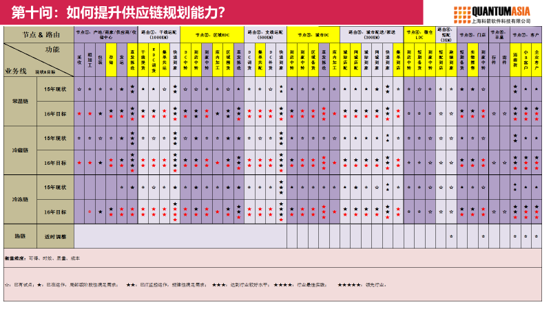 供應鏈網絡是由結點和路由組成的。一個網絡里面有很多結點,把點連接起來的叫做路由。每個節點和路由具備很多相應的功能,主營業務被抽象成一個個條塊。結點和路由形成的供應鏈網絡能不能支撐業務板塊,支撐到什么程度,業務板塊需要供應鏈網絡具備什么功能,對這些能力實現程度可以進行打分評估,最終形成一張能力建設規劃表。通過這張能力建設規劃表,就可以對整個供應鏈能力現狀有一個清晰全面的認識,再根據業務需求強烈或者對業務支撐促進的重要性,來規劃下一步重點建設的功能。
